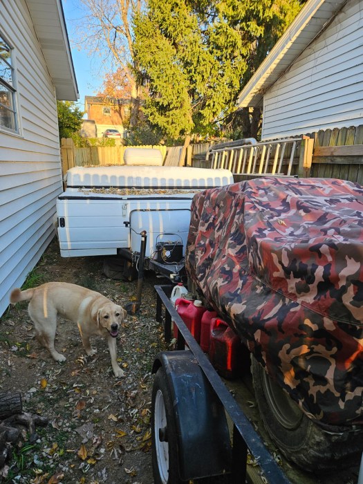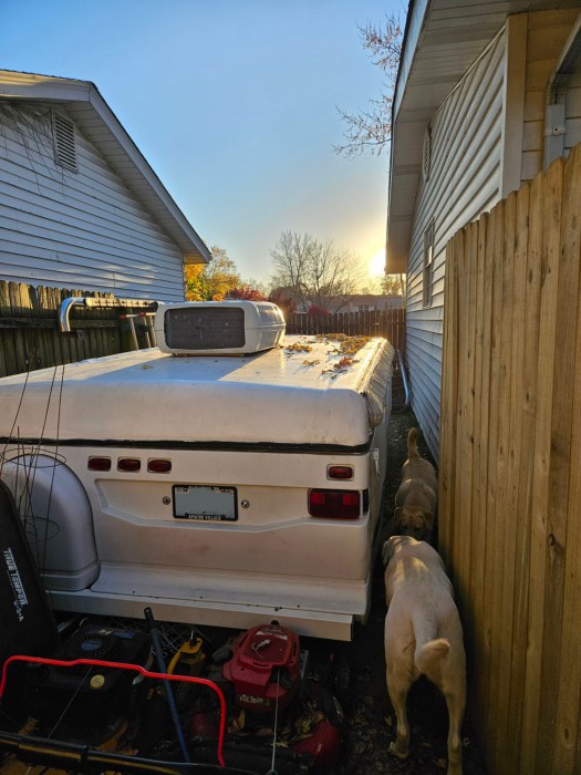 I haven’t seen the camper in a while since I haven’t been to our recreation lot in a long time. I totally forgot how wide it was. It barely fit into the enclosed fence beside the house. It cleared the fence posts by mere inches and lucky for me, I didn’t have to do the ground guiding. I left that up to my granddaughter and the Great Hunter’s friend. I backed out of that task right away because I know how these things go with me and the Great Hunter. He can’t hear me half the time and gets frustrated and I get frustrated because he gets snippy and on and on it goes. The Great Hunter did an awesome job of getting it into the tight space and the only casualty was one of the exterior lights on the camper.