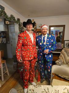Our gifting always takes place after we eat but since two of our kids had other places to go, we didn’t get to dawdle too long. My daughter, the master of all things crochet, made hats for several of us and my son and grandson came in matching (but different colors) Christmas suits.