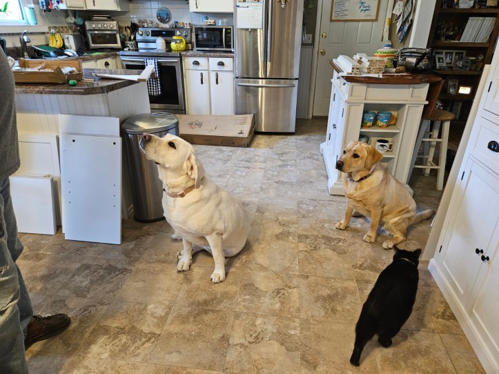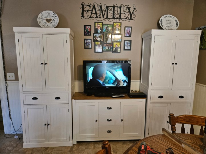 We’ve also been busy this last week putting together two kitchen pantry cupboards and a buffet and managed to do it without killing each other. What a major coup that was. The Great Hunter has Essential Tremors caused possibly by the toxic water at Camp Lejeune from when he was stationed there in the ’60s. The Marine Corps, of course, denies this. It’s difficult for him to work with small items because his hands shake so badly and there were lots of small screws and things. So for once, it was me doing most of the work (plus, I follow directions better) and he was my assistant handing me tools and supplies.