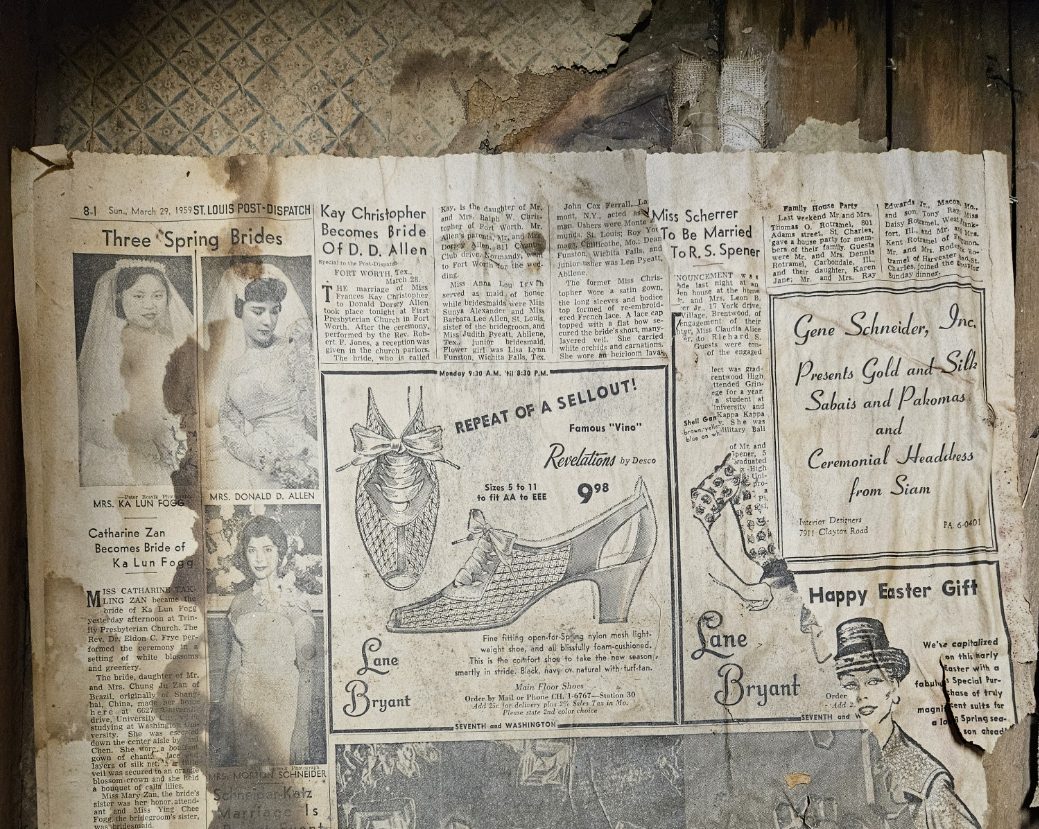 In the midst of my basement reno, my ADD kicked in and I got distracted by this trunk. The bottom of the trunk is in really rough shape and is still covered with newspapers from 1959. The thing about these newspapers is I’m sure my mom put them there. I guess that’s why I leave them, all tattered and stained. It’s the only thing that exists that is still where my mom put it almost sixty years ago.