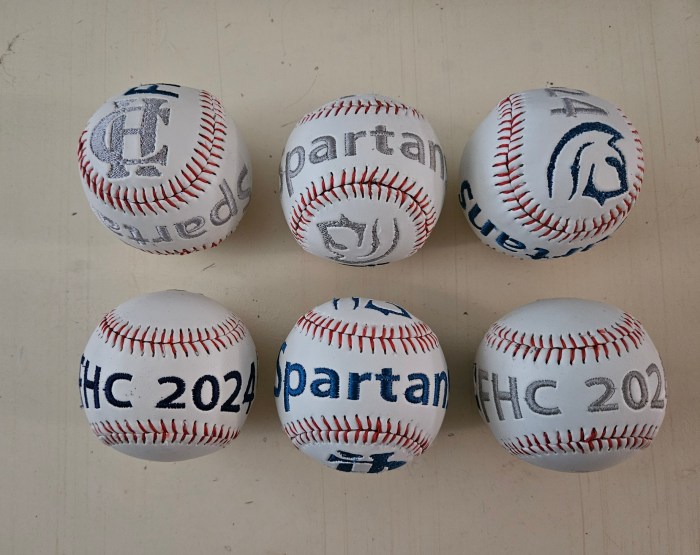 My embroidery machine and my hands really got a work out this week too. Six baseballs made for the six seniors on my grandson’s baseball team. Each ball takes about a total of four hours, from start to finish…dismantling the ball, hooping and embroidering the cover and resewing the cover back on the ball. This last step took the longest, about two hours per ball. They’re not perfect, but I think they’re the best I can do.