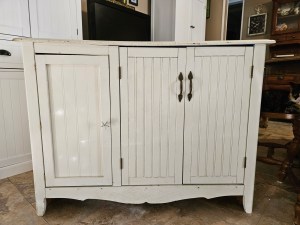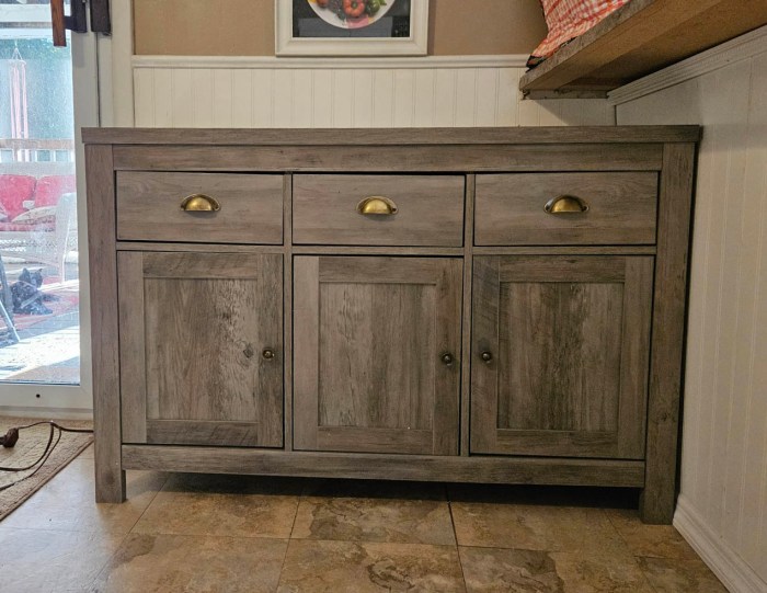 I’ve wanted to replace my old buffet for a long time. It isn’t real wood and over the years it’s been used…a lot. It was one of the first pieces of furniture that I ever put together. Now it is mostly a cat feeding station. I have to feed them where the dogs can’t reach or the poor kitties would starve. This is probably not ideal, but in our house, the animals rule. After all…