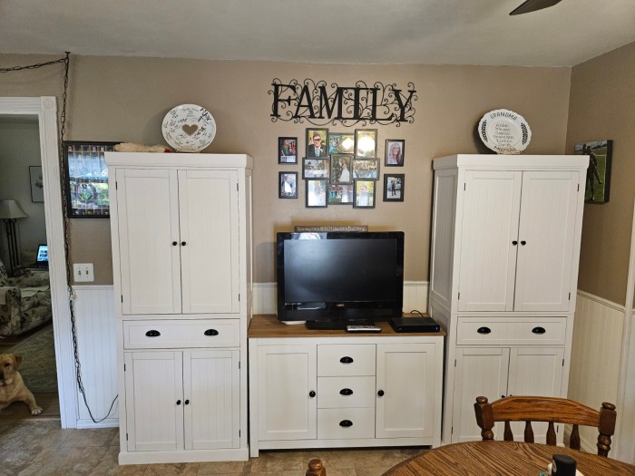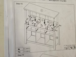 I found this new one on Wayfair. It was the right size and fits my space, so I bought it. The Great Hunter and I managed to work through the directions that rival those of Ikea. All was going pretty good until we got to this page. We were getting near the end and we’d put the top on only to realize the back pieces, which I didn’t even realize were depicted, had to be put on before the top. Crap. We took the top off, fixed that step and put the top back on. I started to work on the drawers only to realize we had a piece on backwards. Let me tell you, the Great Hunter wasn’t pleased when I told him we needed to have to take the top off AGAIN. But we did. We called it a day and I finished the drawers and doors the next day.