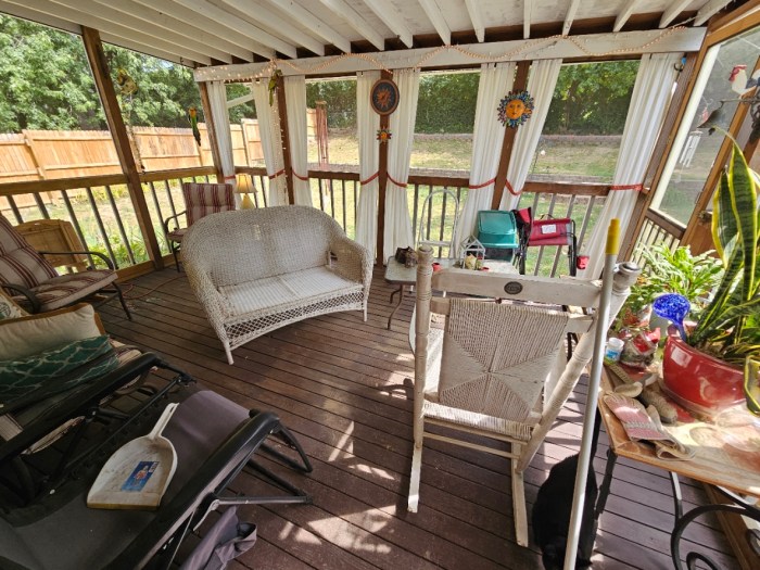 I’ve been looking at my deck lately and realizing we don’t use it very much except as a way to get to the backyard. It is a nice size, 18′ x 12′ but I have too much furniture and none of it is very comfortable. But deck furniture is expensive, so I have to make do. The other thing is because the deck posts are so close together, they tend to block the view of the yard. Nothing short of redoing the deck would fix this , so again, I have to make do., but maybe, I could rearrange the furniture. What a novel idea.