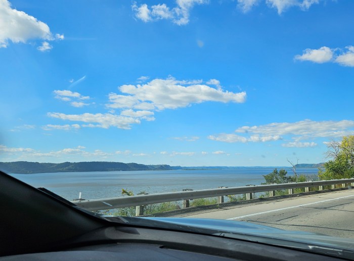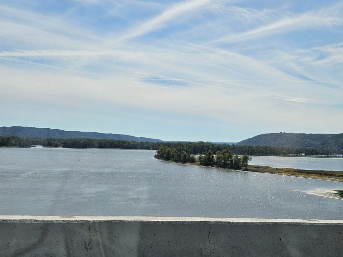 We crossed the Mississippi from Iowa into Prairie du Chein, Wisconsin and continued north about 35 miles to La Crosse. When we got about halfway between Prairie de Chein and La Crosse, I got my first glimpse of “their” Mississippi River.