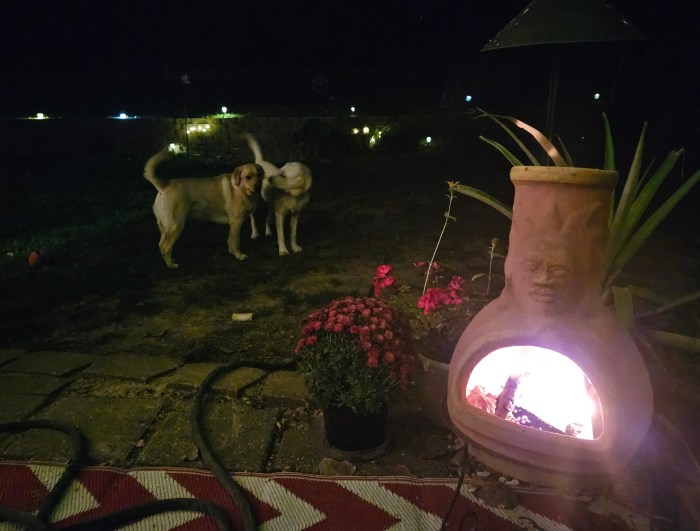 Oh, and a small fire in my chiminea on this beautiful Friday evening while the Great Hunter is on a motorcycle ride to Milwaukee with his sons.