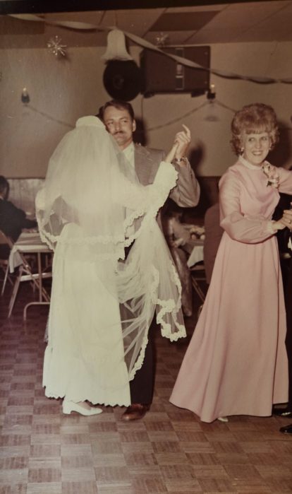 I remember going to the fabric store to pick out fabric for my wedding dress that she made for me (and it’s still hanging in the basement closet). I remember going to the church with her on my wedding day and she told me she hoped I would be as happy as she and my dad had been. (I wasn’t, it lasted only seven years.)