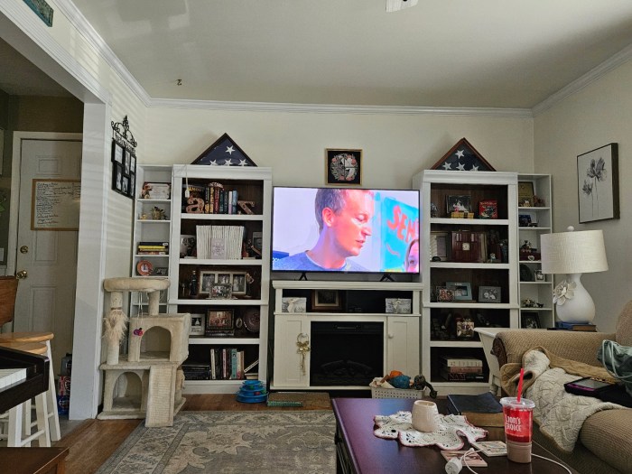 and bought and put together tall skinny shelves to abut the larger living room shelves,