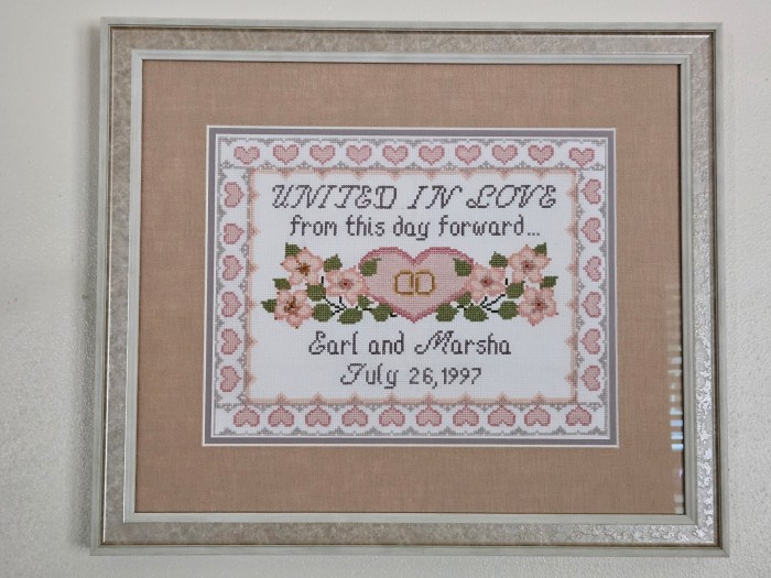 I finally finished a counted cross-stitch wall hanging I’d started….twenty-eight years ago, when the Great Hunter and I got married. I decided, since it took that long to get it finished (it probably lay buried and untouched in a drawer for twenty of those years), I’d treat myself to professional framing. I took it to a good friend of Bruce’s who owns a frame shop, much the same as Bruce had owned for many years and he did a beautiful job on it.