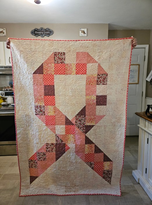 I also finished a quilt I made for a dear friend who is battling breast cancer. She lives at the opposite side of the state and although we were very good friends for all our years in school, she moved and although we’d see each other at church when she would come to visit her parents, we had never spent any time together. We call ourselves “birthday twins” because, along with her dad, we were all born on the same day. Two years ago, we decided to get together and met in the middle of the state and spent a great afternoon talking and catching up on our lives and families. We decided that day that we would make this an annual thing.