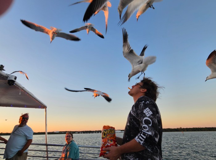 They feed the seagulls Cheetos. Our guide, who said he was a “certified Cheeto specialist”, let one take a Cheeto from his mouth. He did instruct us not to try this at home, lol. And, by the way, Autocorrect, yes, indeed, I want the word “Cheeto” not “Cheryl.”