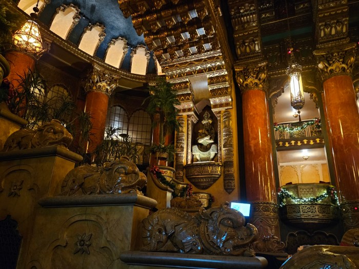 The Fox was designed by an architect specializing in theaters, C. Howard Crane, in an eclectic blend of Asian decorative motifs sometimes called Siamese Byzantine….Reporters in 1929 described the Fox Theatres in St. Louis…as “awe-inspiringly fashioned after Hindoo (sic) Mosques of Old India, bewildering in their richness and dazzling in their appointments … striking a note that reverberates around the architectural and theatrical worlds.” William Fox nicknamed the style the “Eve Leo Style” in tribute to his wife, who decorated the interior with furnishings, paintings and sculpture she had bought on her trips overseas.