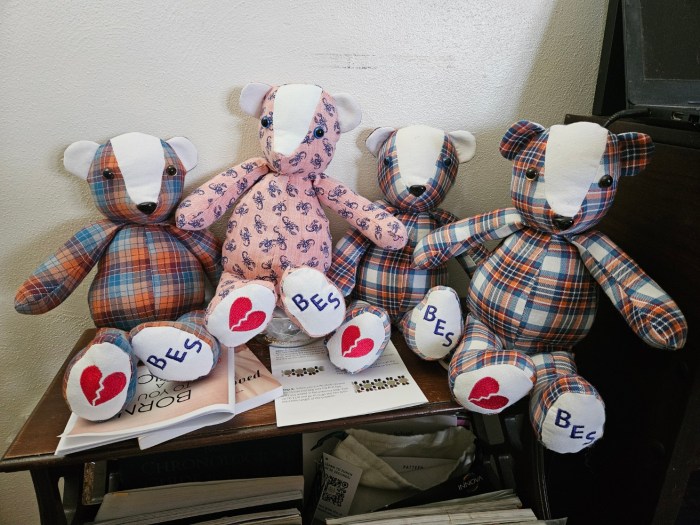 Last summer, when the Great Hunter and I got together with my brother-in-law, he gave me a box full of shirts that belonged to my brother, his husband. I left them in that box for several months and then finally got the courage to go through them and choose which ones I wanted to use to make memory bears. I ended up taking all but about six of the shirts to the local Catholic charity, and the rest I put back in the box. I knew I wanted to make the bears for Christmas, but it was really, really hard to take each one of those shirts out of the box (and they still smelled so very nice) and cut them apart. It was even harder to figure out what personalization I wanted on them. In the past I’ve used the phrase “Alive in Our Heart” but somehow I knew that wouldn’t work. I also knew that I could not put his name on them either. So I settled for just his initials and a broken heart. I shed more than a few tears making these.