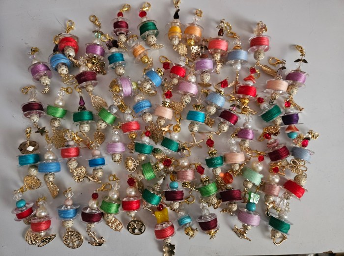 Last year, I made embroidered bookmarks for everyone at the retreat. This year, I took advantage of all the empty bobbins I’ve collected from my embroidery machine and some beading supplies I had and made bobbin ornaments.