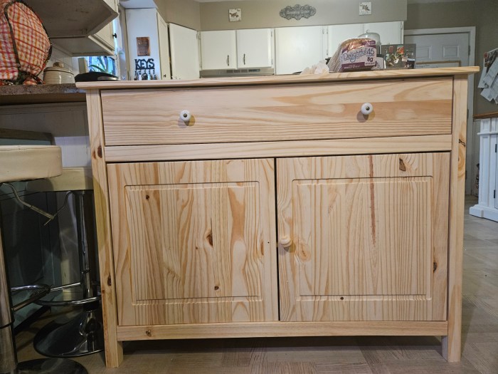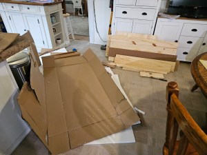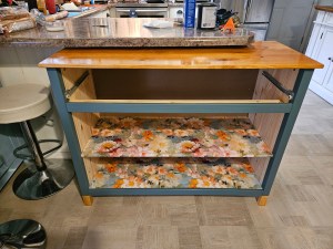 It went together very easily, even though none of the parts were labeled. I painted it and put the semi-gloss topcoat on…but I’m not happy. I’ve never worked with raw wood before and it wasn’t until after I had painted it that I realized I should have sanded all the doors first. They are not smooth. I thought once I had the top coat on, it would make it smoother, but it isn’t smooth enough. Now, I’m in a quandary as to what to do. I ordered some rattan that I’ll paint and put on the doors. If I still don’t like that, I’ll have to bite the bullet, take the doors off, sand them down and start over. Unfortunately, there’s also a problem with the bottom trim bowing up causing the right-hand door to drag. Sigh.