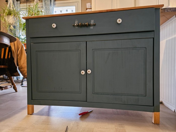 A couple of years ago, I replaced the 20-year-old Sauder-brand sideboard I’d paid about $100 for. It had just seen its better days. I looked for a long time to find one that would fit into the area I wanted and finally found one on Wayfair. We had a hell of a time putting this sideboard together and had to take it apart twice before we finally were able to finish it. Once finished, I knew I didn’t like it. I didn’t like the color, so I painted it. We were never able to get the top to fit correctly and it left a gap above the drawers. I just didn’t like it. We use this piece of furniture as a cat feeding station (so the dogs don’t eat the food before the cats get a chance), and since both my kitties are “big boned” (we’ll just go with that), there just wasn’t enough room for the two of them.