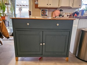 A couple of years ago, I replaced the 20-year-old Sauder-brand sideboard I’d paid about $100 for. It had just seen its better days. I looked for a long time to find one that would fit into the area I wanted and finally found one on Wayfair. We had a hell of a time putting this sideboard together and had to take it apart twice before we finally were able to finish it. Once finished, I knew I didn’t like it. I didn’t like the color, so I painted it. We were never able to get the top to fit correctly and it left a gap above the drawers. I just didn’t like it. We use this piece of furniture as a cat feeding station (so the dogs don’t eat the food before the cats get a chance), and since both my kitties are “big boned” (we’ll just go with that), there just wasn’t enough room for the two of them.